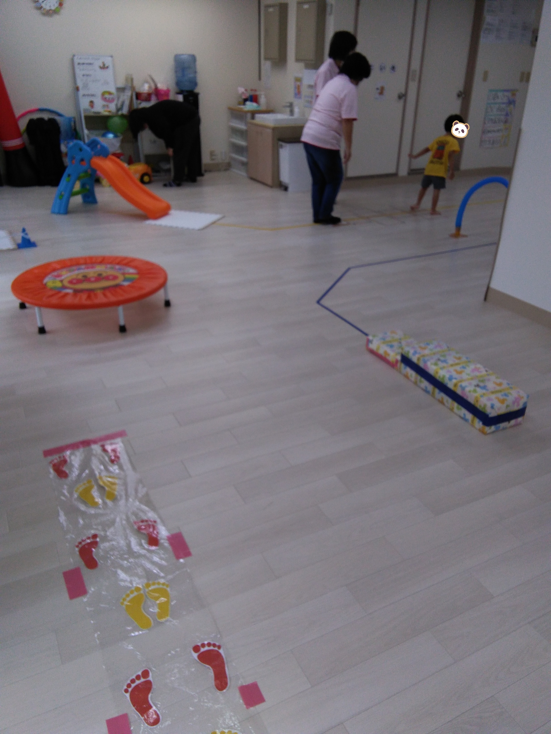 前回のサーキットに、新たに風船トンネル、風船をカゴに入れる、スタッフとハイタッチ、足型グーパージャンプを加えました☺️