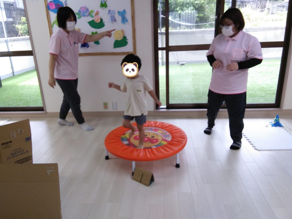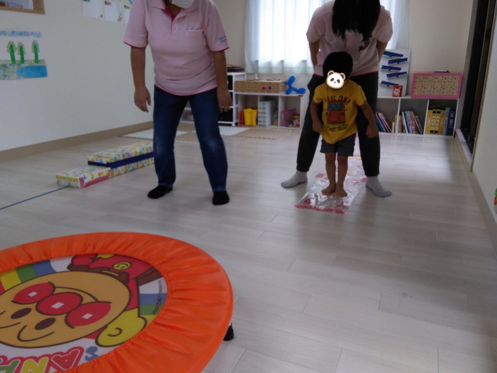「グーパージャンプ」は、足の形に合わせて足を閉じたり開いたりすることが難しかったようですが、スタッフが✊🖐️「グーパ−」の声かけをしながらゆっくり行うことで最初より上手になっていましたよ🤗頑張って取り組む事が出来たね😊