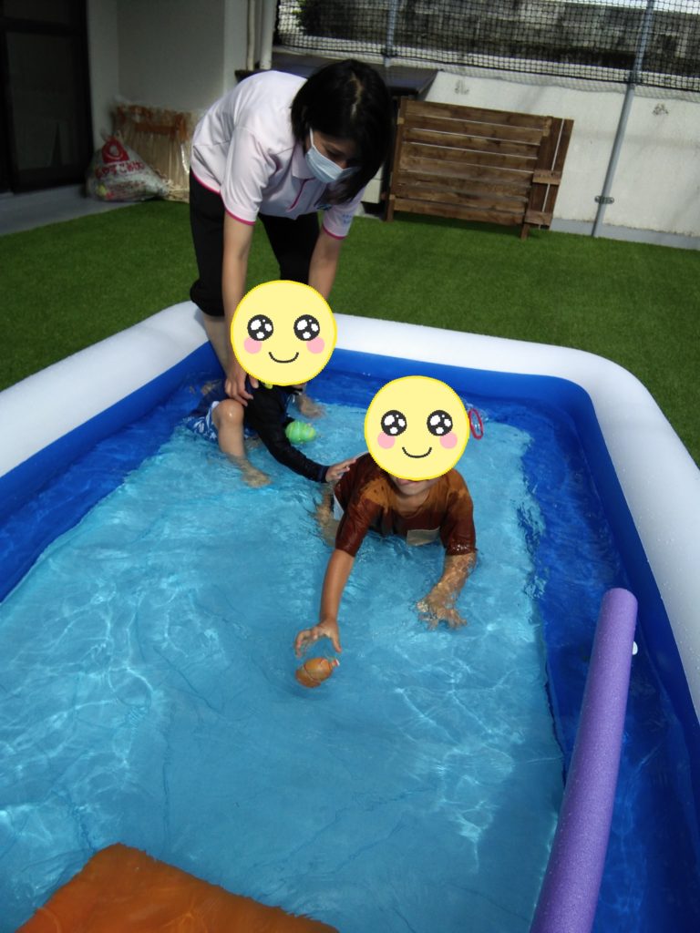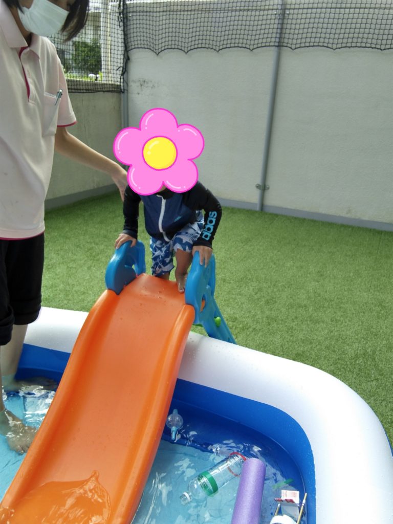 いつも室内遊んでいる滑り台をプールに入れると児童達は、大喜び👏👏繰り返し滑り台を滑り台楽しんでいました💦
