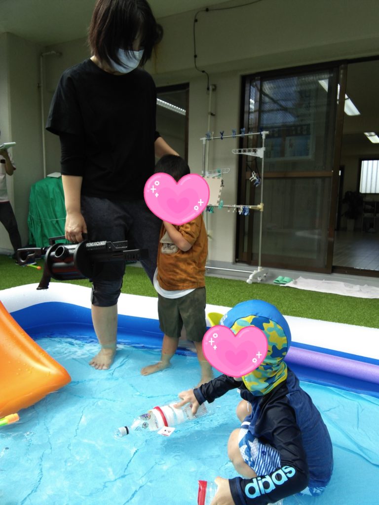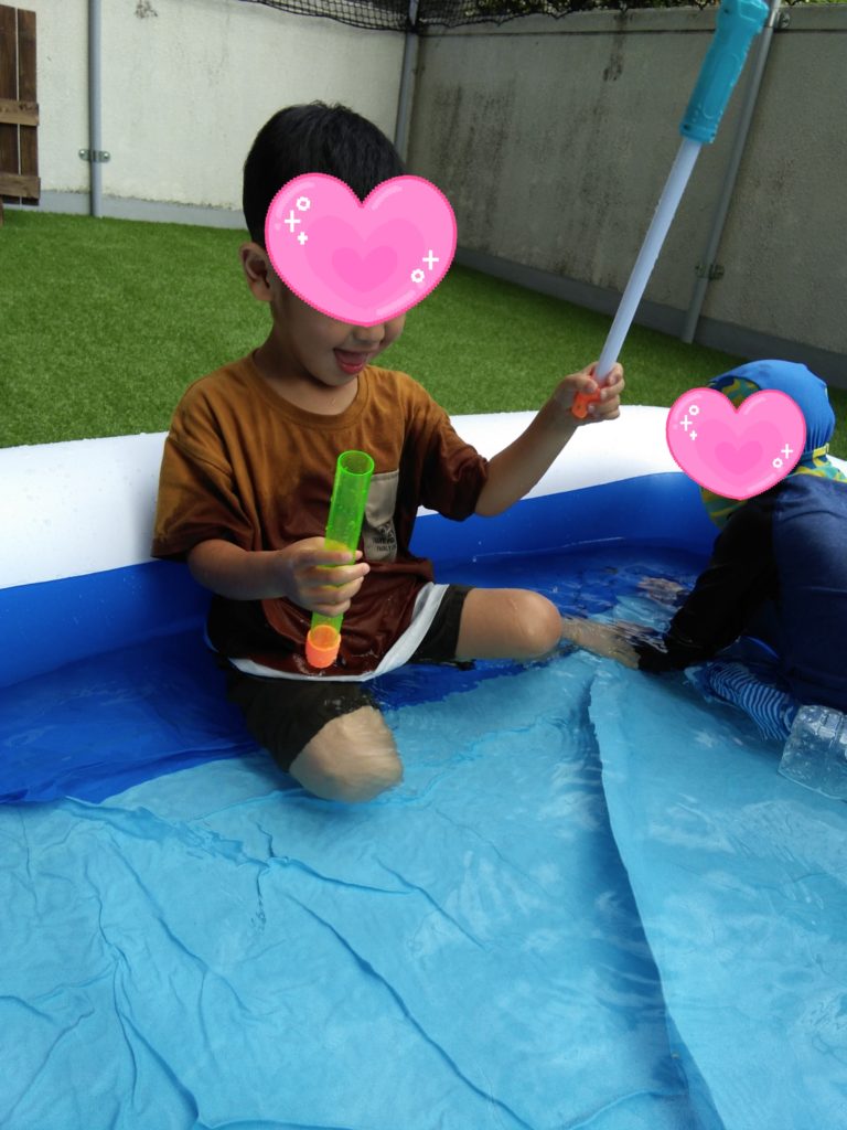水鉄砲にもチャレンジしました!!水鉄砲から水が出てくるのを見てにっこり笑顔になり、可愛かったです❤