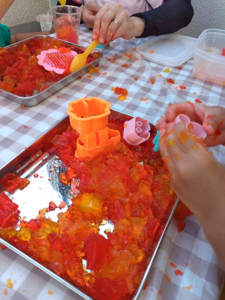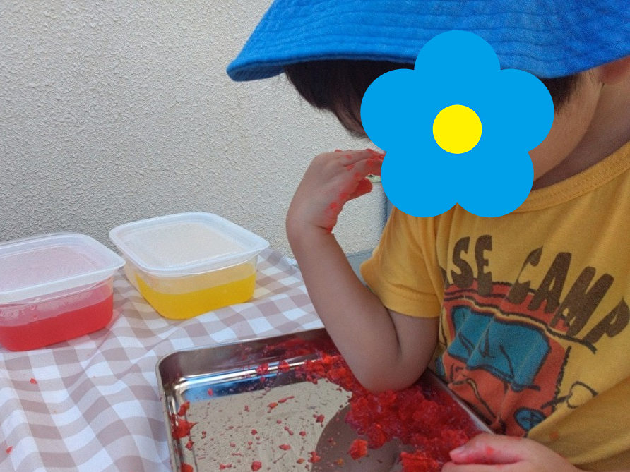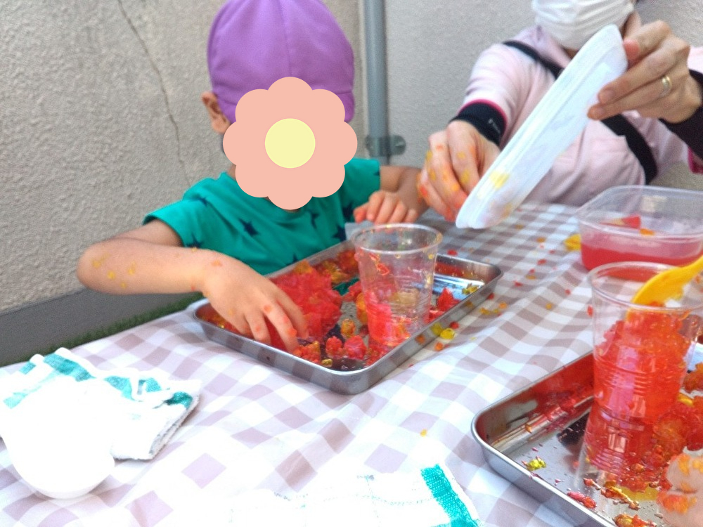 今回初めて参加するお友だちは、赤や黄色の寒天にとても興味津々👀