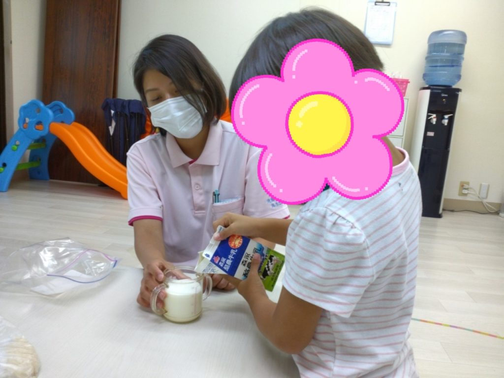 スタッフと一緒に材料を計量カップで計る事にもチャレンジ!