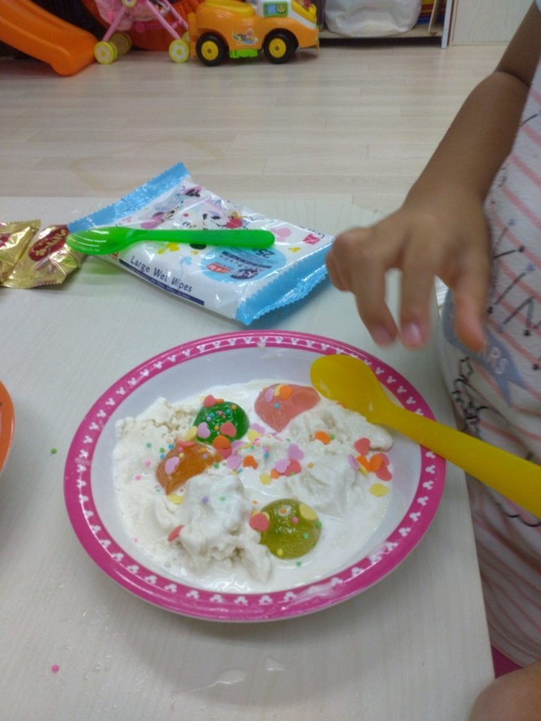 出来上がった🍦アイスクリームにカラフルなトッピングやゼリーを飾り付け〜〜🎶