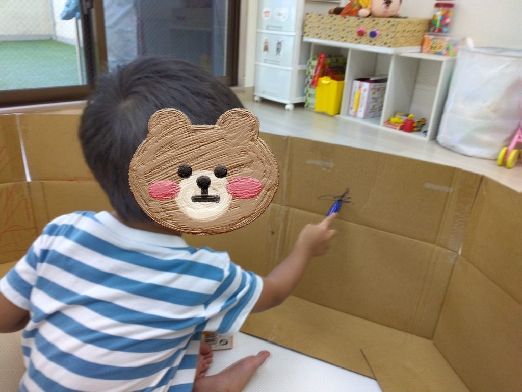 最後は、みんなで新聞を片付けた後、囲いの段ボールに思いっきりお絵描きをしてもらいました。