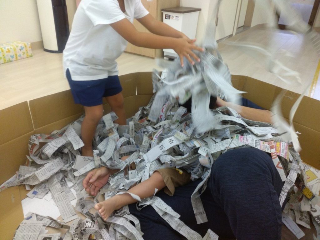 その次は、「1、2、3、、、やあぁ~♪」と新聞紙をみんなで上に投げて新聞紙の雨を浴びます✨躍動感伝わりますでしょうか?(^^♪