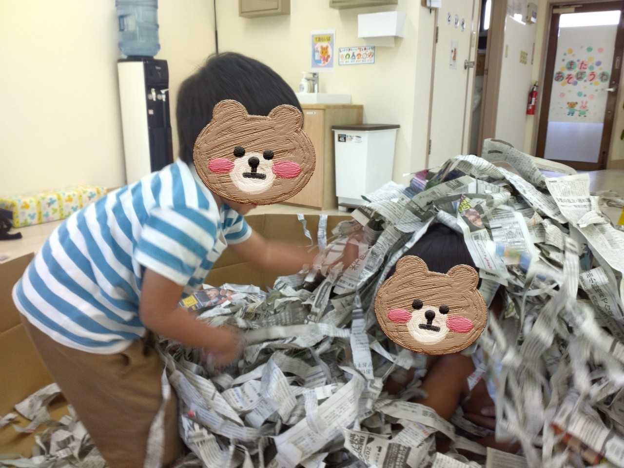最後は、みんなで新聞を片付けた後、囲いの段ボールに思いっきりお絵描きをしてもらいました。