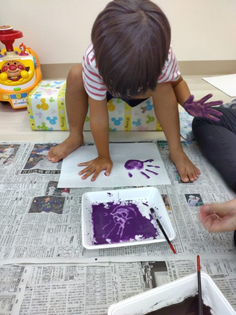 右足👣に絵具をつけます!「うわぁ~、冷たいい♪」と絵具の感触を楽しんでいる様子。