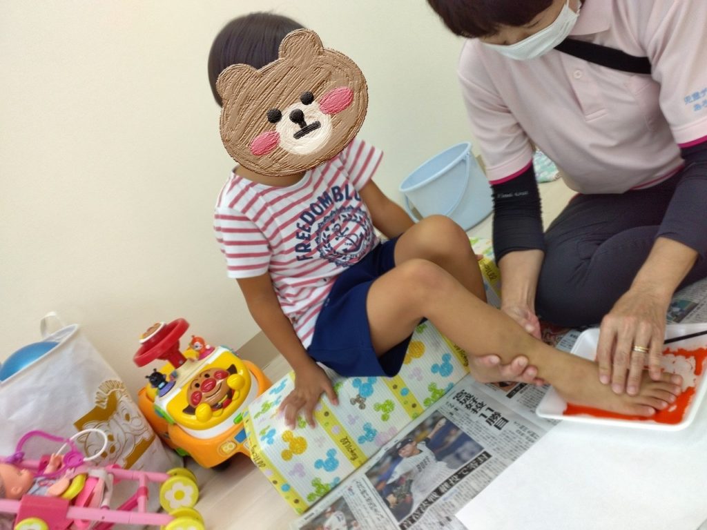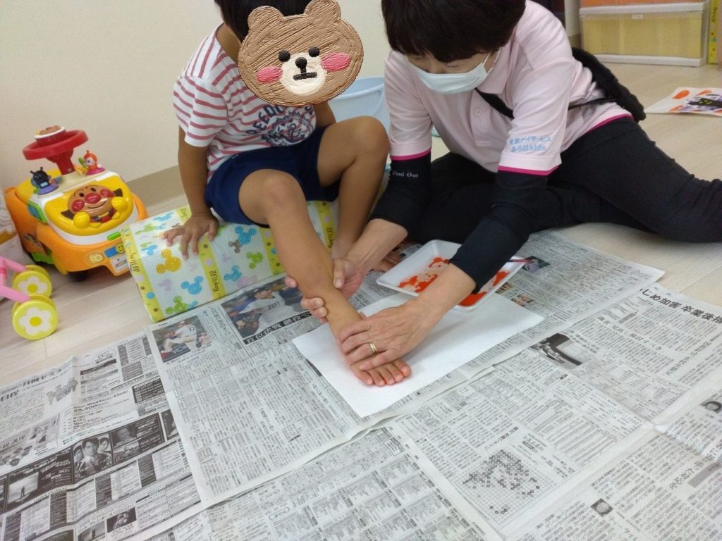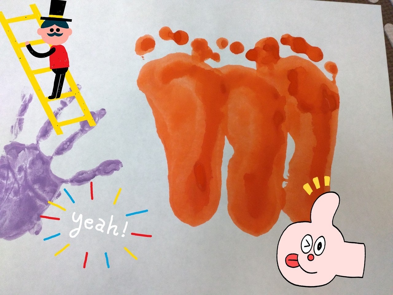 「足をオレンジ色🍊にしてペタペタ、足の形をつけるよ~」と説明をしていると、
