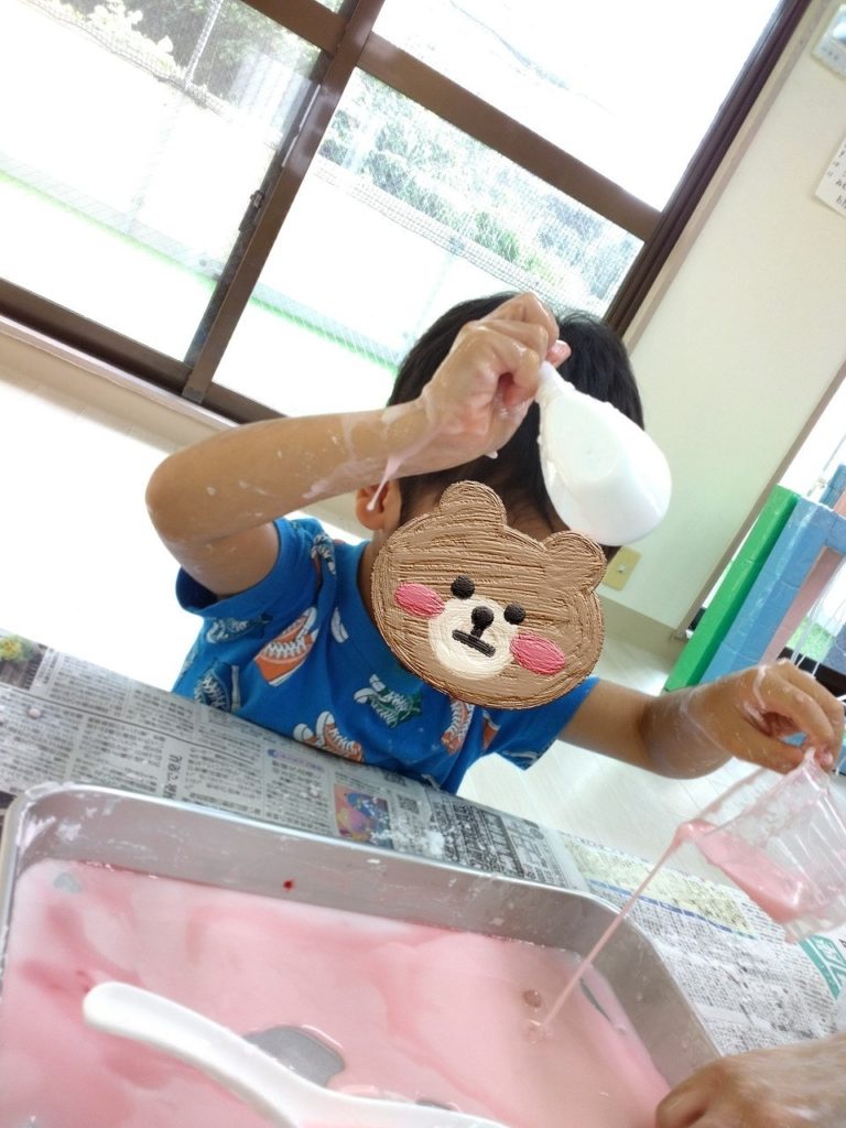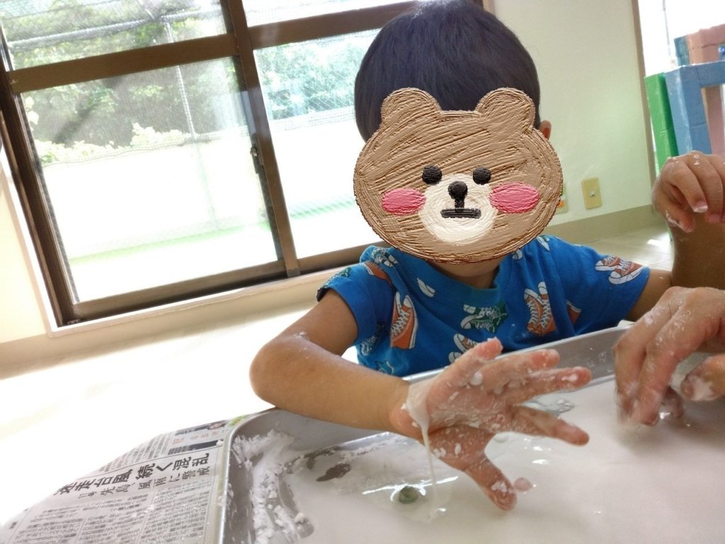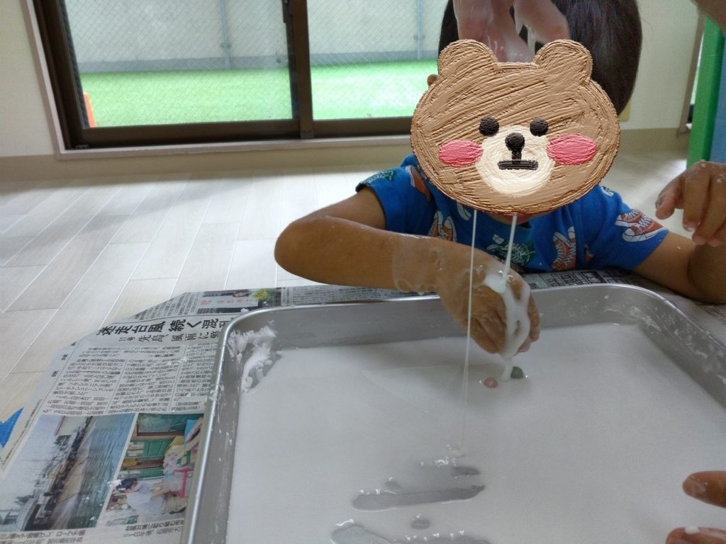 こんなにトロトロなのに、握ると固まって、しばらくすると溶け出して、、、とても不思議な現象がいっぱいな遊びでした😊