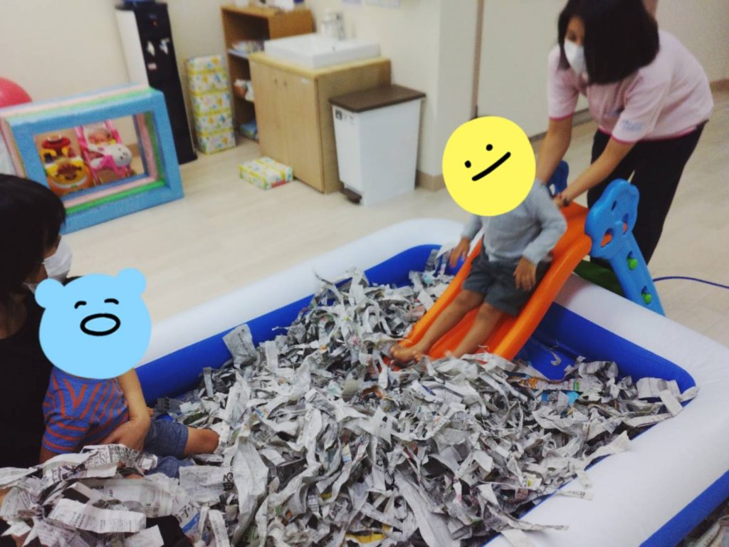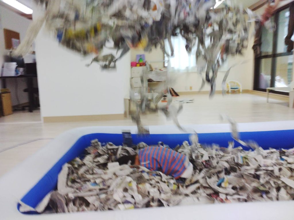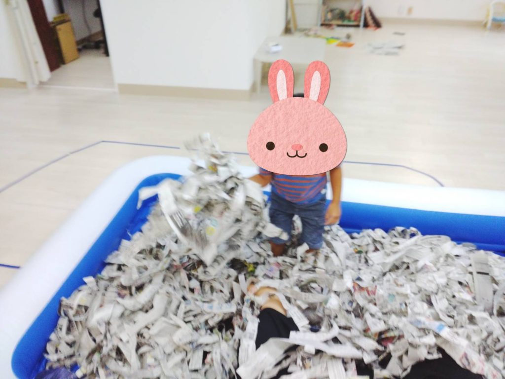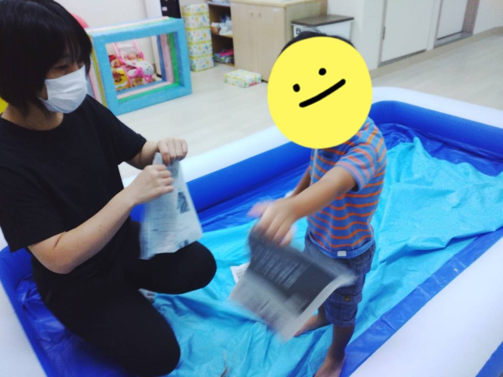 午前中は、新聞遊びをしました!プールいっぱいに新聞をするためにビリビリ~