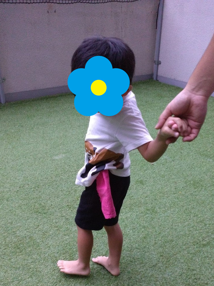 最初に赤いしっぽをつけます。お友だちはおしりの方につける事を少し嫌がっていたので、自分から見える横側につけました。スタッフもしっぽをつけて、「逃げるから追いかけてしっぽ取ってね~」と声をかけました。さぁ~ゲームスタートです😄