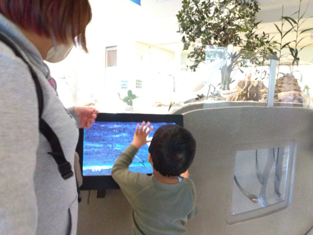 最初は展示室に入るのを嫌がっていましたが、モニターを見つけた後はスムーズに入ってくれました✨画面に映るさまざまな鳥🦢🦅を手で触ろうとしてました✋