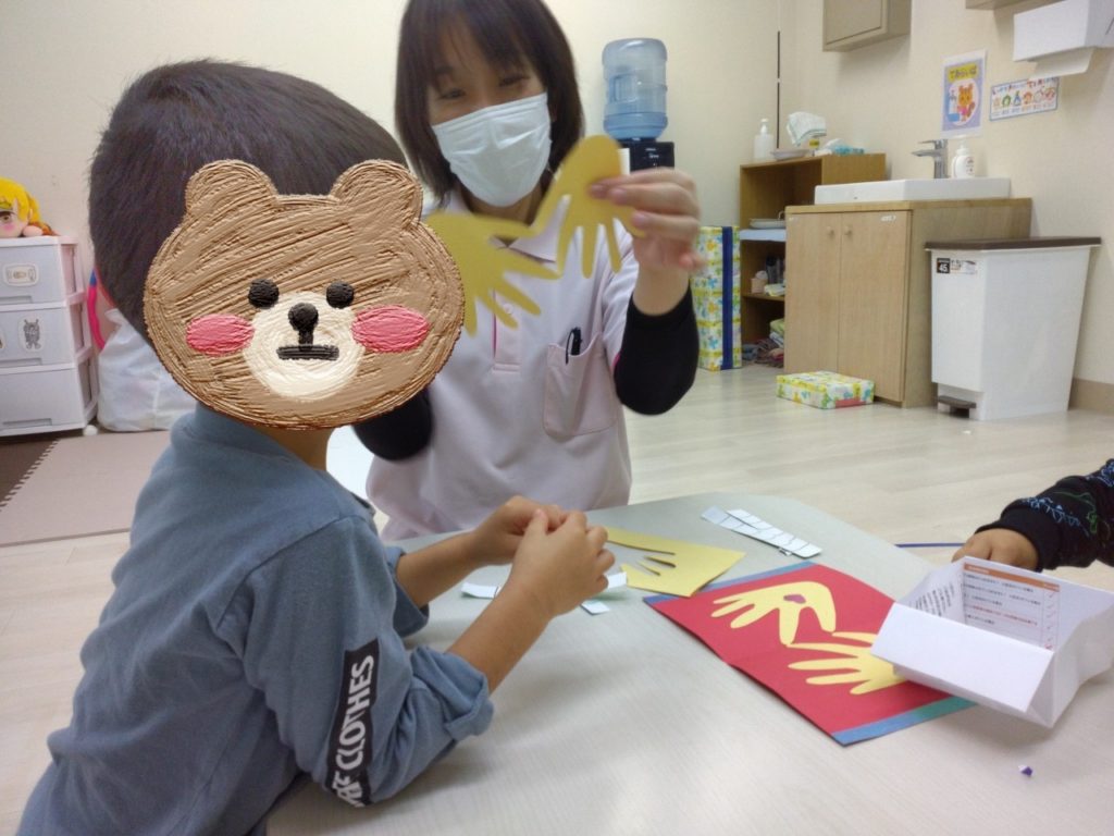 まず、みんなそれぞれの手型を取りました!この手型を台紙に張り飾りつけをしていきます♪