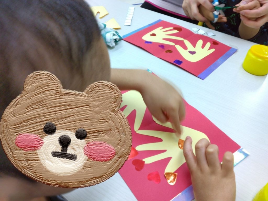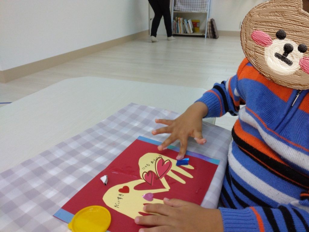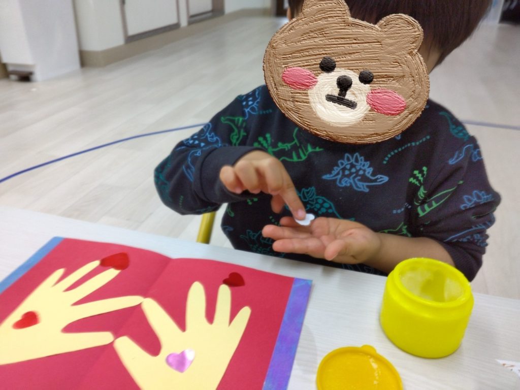 実はお友だちの手型で、ハートマークを作っているんです😍愛が溢れるメッセージカードの完成です🌟みんな制作とても上手でした~(*^-^*)