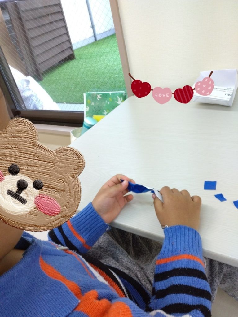 こちらのお友だちは、指先に集中して小さくちぎっていました♪ちぎりながら、「三角になった~!」と形の変化を楽しんでいる姿もみられました!(^^)!