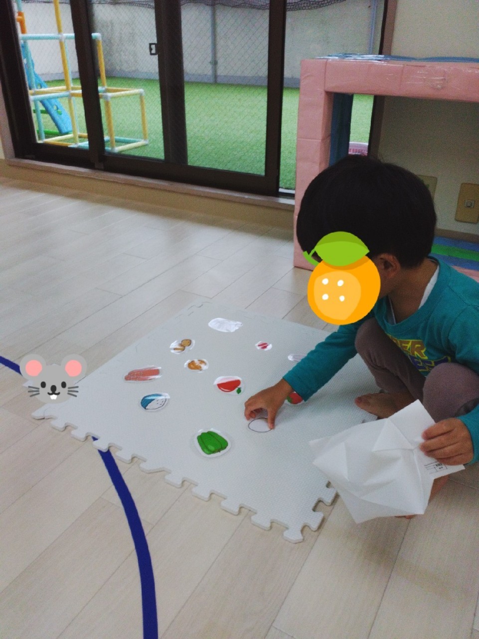 内容は料理のレシピ(必要な材料)のイラストを見せて、別の場所に置いてある材料を探すという流れです🍎