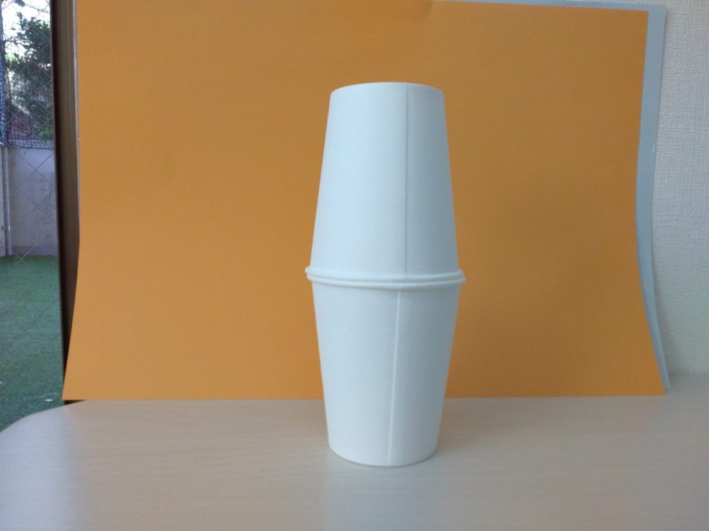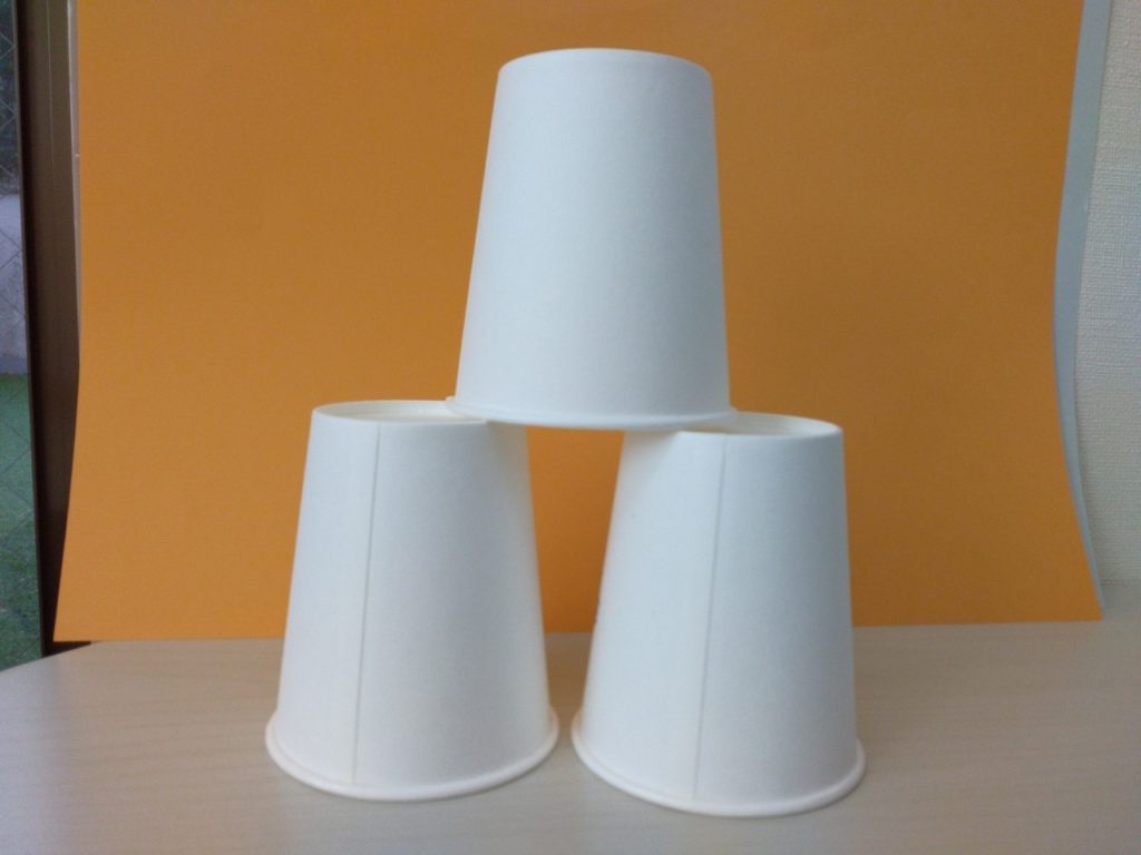 よし!上に1個のせたら完成だ!!紙コップを1個取る作業が、少し難しいようです💦