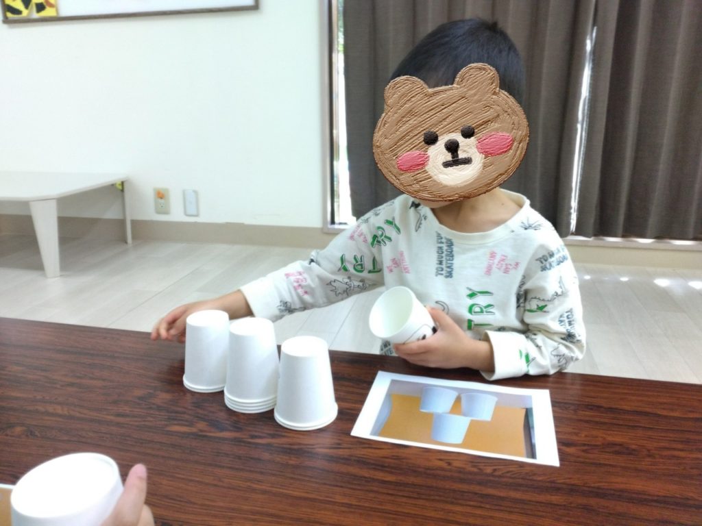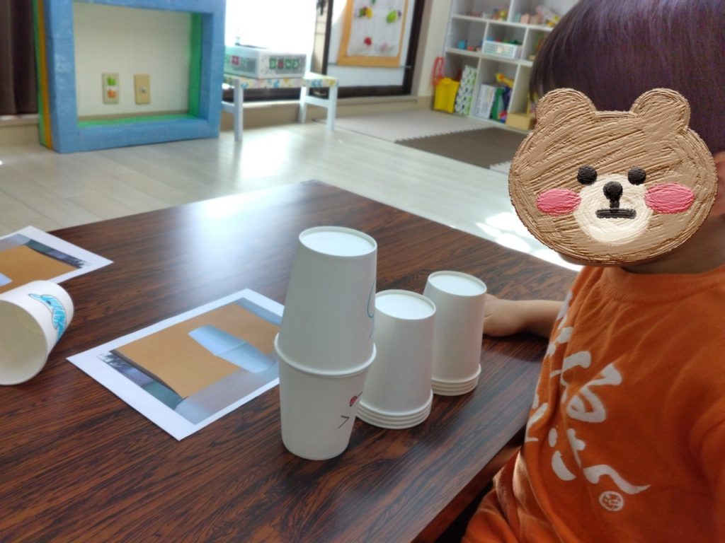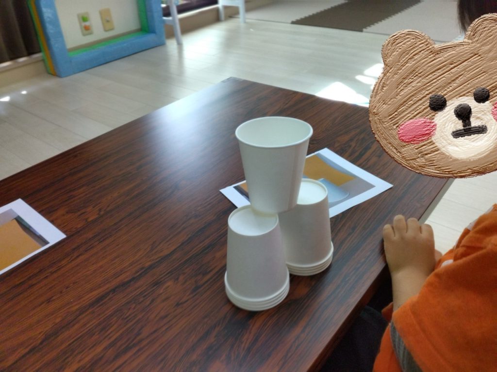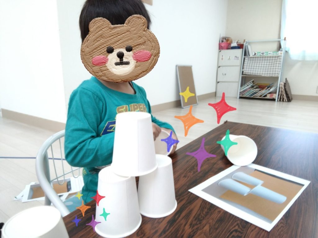 こちらのお友だちは、紙コップ2個を並べて、その上に1個乗せる!としっかりイメージは出来ている様子です!