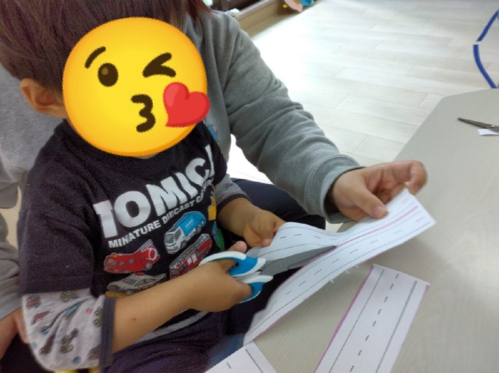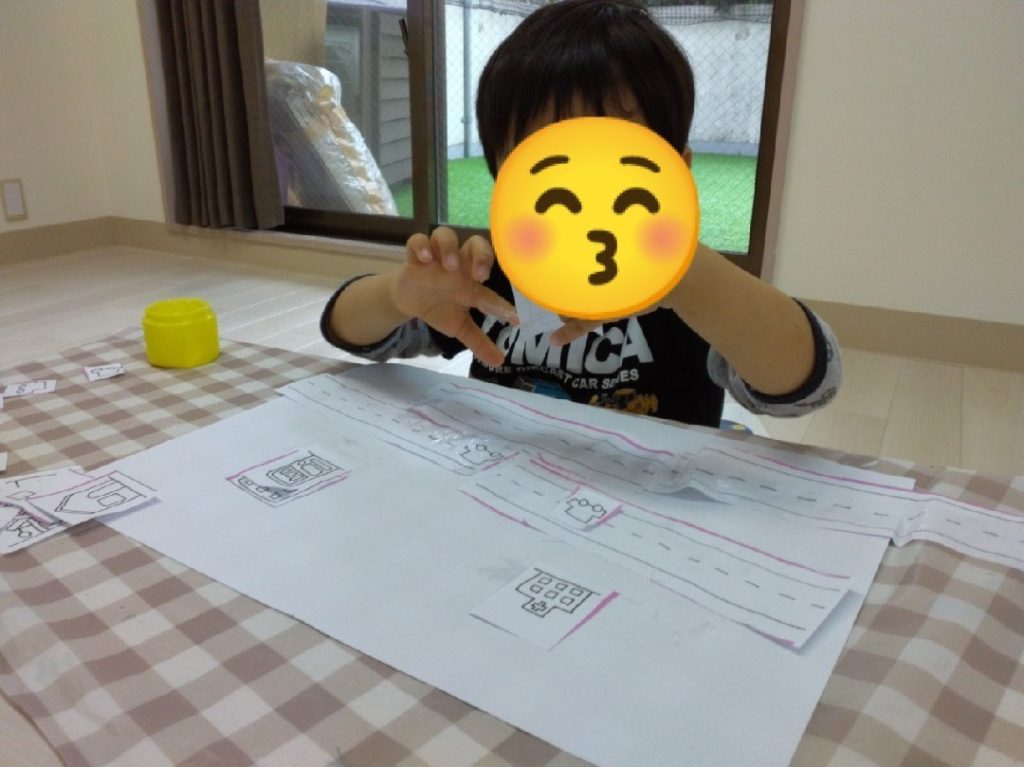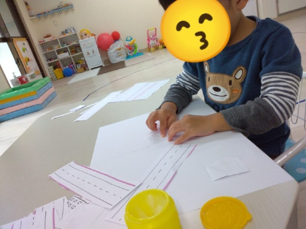 切り終わったら、大きい紙に道路や、車、建物をのりで貼って、街を作っていきます!