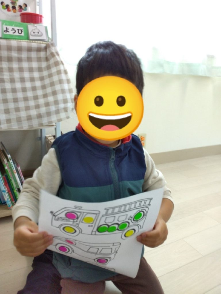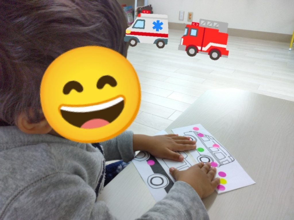 消防車、救急車、パトカーの絵にシールを貼っていきます!