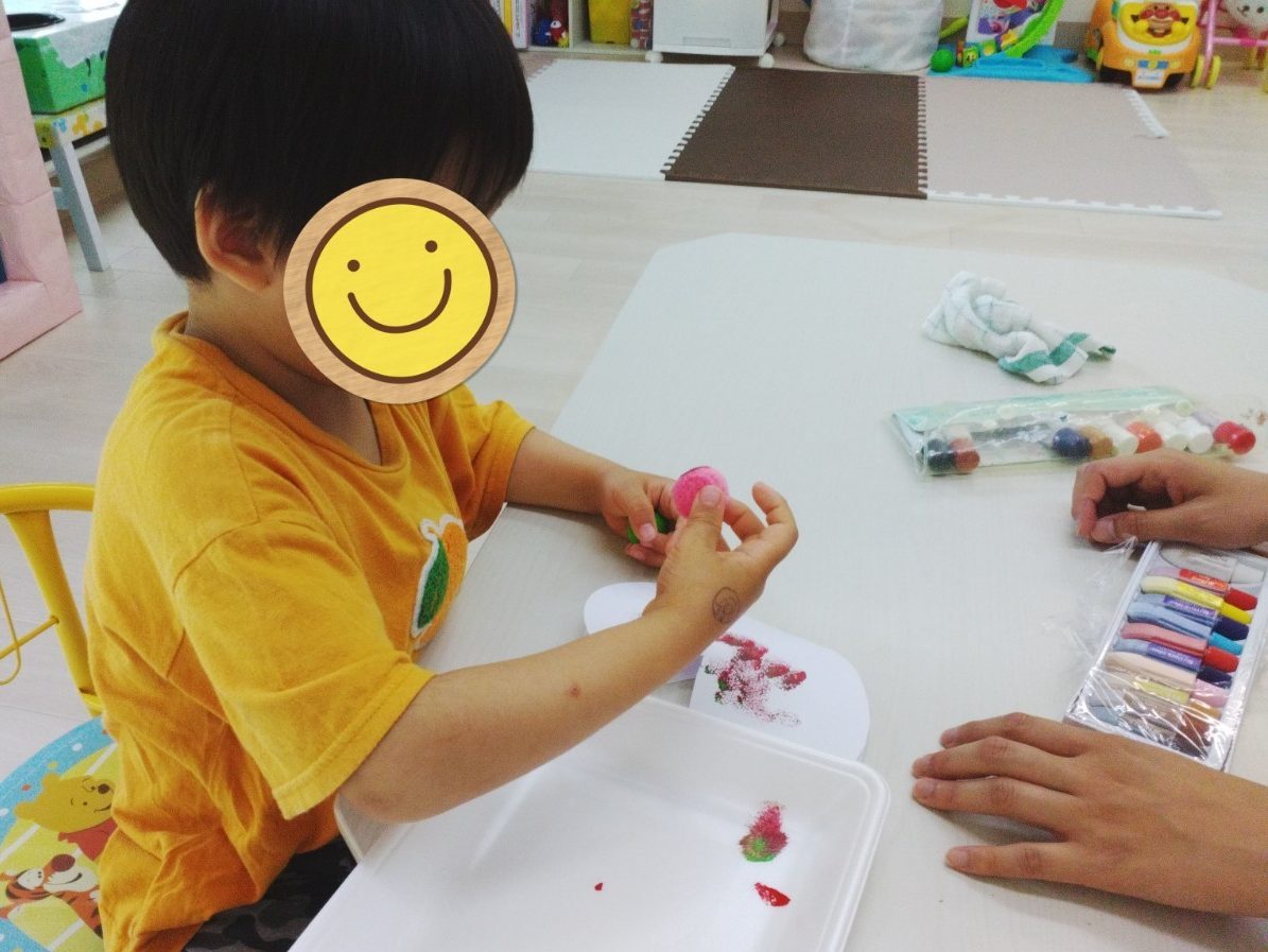 初めて使うポンポンに、ちゃんと色がついているか確かめるお友だち。。。確認してから紙に描いていました。