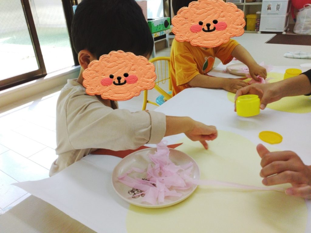 始めに『おはな紙』をちぎります。繊維の方向でやりずらい箇所もあるので、スタッフも一緒にお手伝いします😊