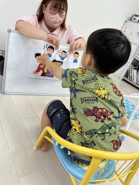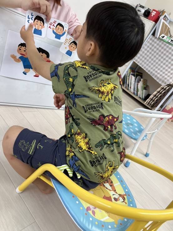 いろんな場面が描かれたイラストをスタッフが見せ、「こんな時どうする?」と質問し、相手の気持ちを考えながら答えてもらう課題です🤔💭