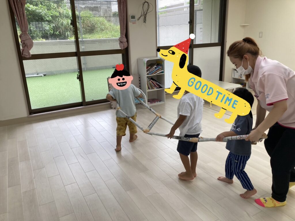 今日の課題はお散歩ビンゴの予定でしたが、台風6号が接近中のため、予定を変更して「電車ごっこ」を行いました!🚃