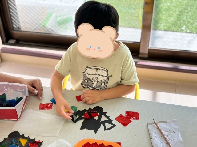 カラーセロファンをハサミで✂️チョキチョキして、あらかじめカットしていた、🎃かぼちゃとコウモリ🦇に貼り付けました。