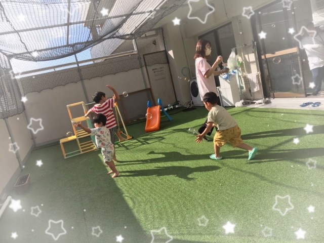 自由時間はテラスでしゃぼん玉遊びをしました。しゃぼん玉を追いかけたり、パチンと消したりとそれぞれに楽しんでいましたよ🤯