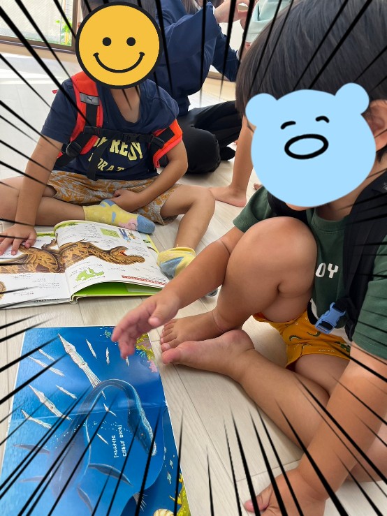 帰りのお支度が済んだお友達は📚絵本を見て待っています。お友達と恐竜の本を見せ合っています。大好きな🦖恐竜に大興奮です🦖🦕さあ、帰りの会をして元気に帰ろうね〜🖐️