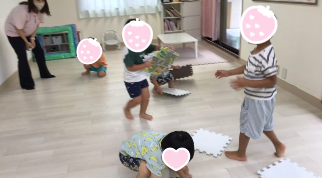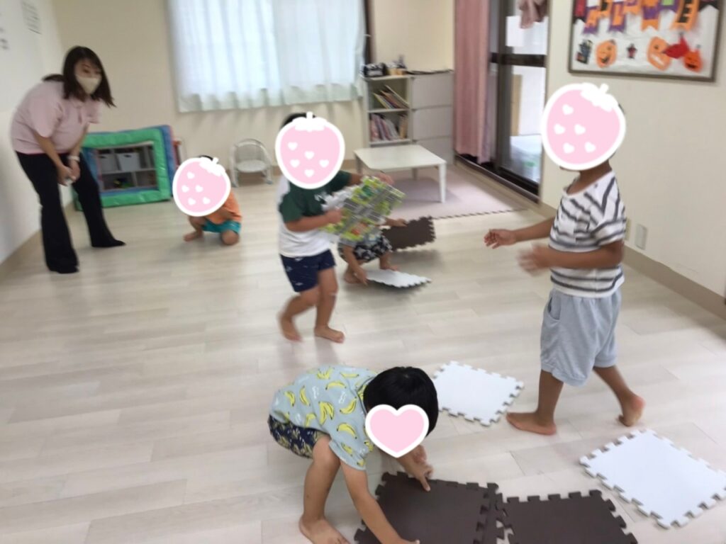 おやつを食べたら課題の時間です!大型オセロはマットを使って行いました!