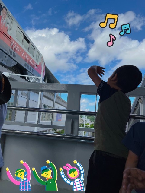 まずはモノレール見学です☝️暑かったけど頑張って歩きました〜丁度タイミングよく真上にモノレールが到着🚋ヤッター「モノレールバイバイ👋」と笑顔で見送りましたよ〜