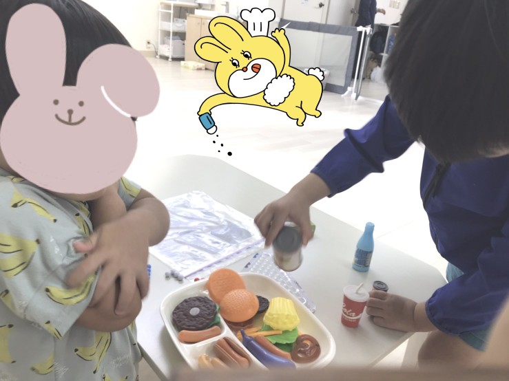 パズルコーナーで遊んでいるお友達に、配膳してますよ〜。「お待たせしました」と接客もスマートです。