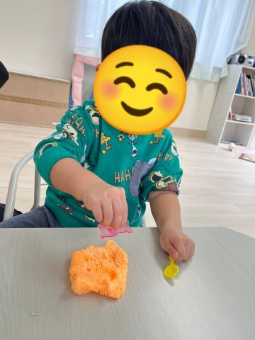 型はめをしたり、スプーンですくったり、