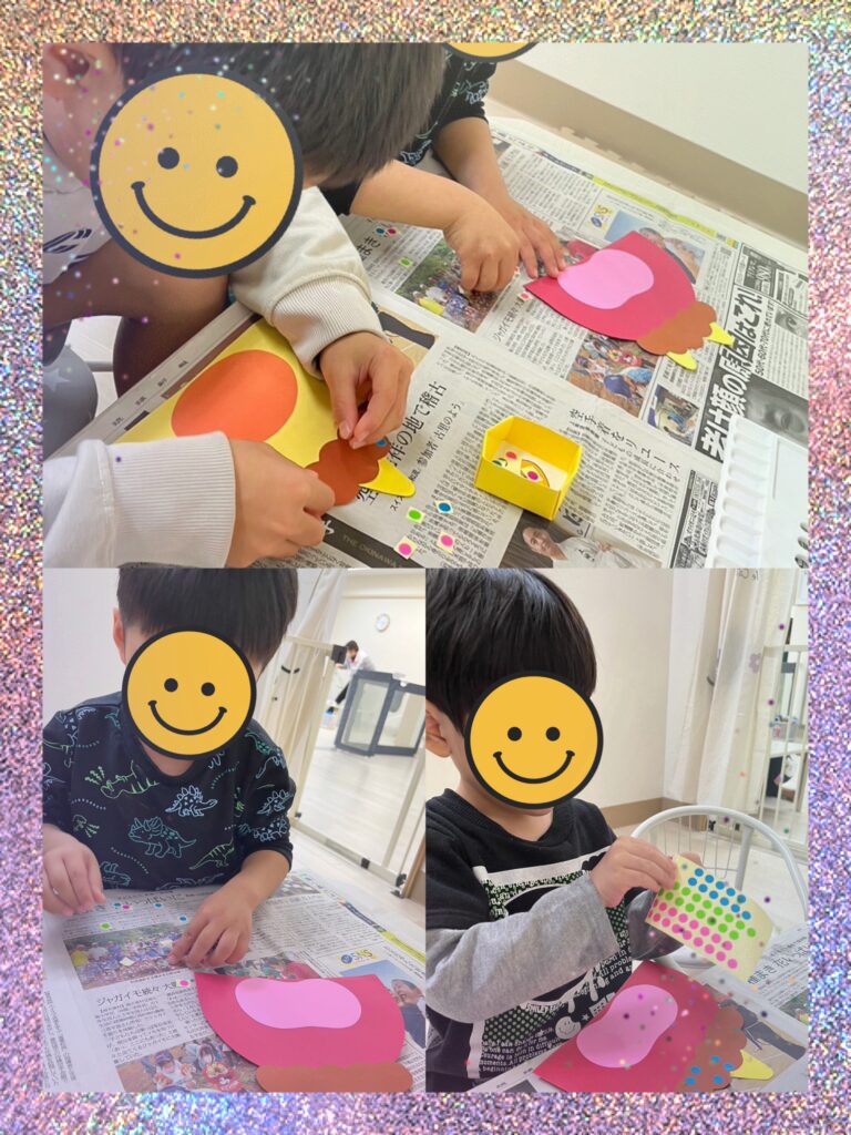 シールの色を1色に統一している児童や貼る位置を均等にしている児童など、さっそく個性が出ていてどれも素敵な作品になりそうですね😊💞