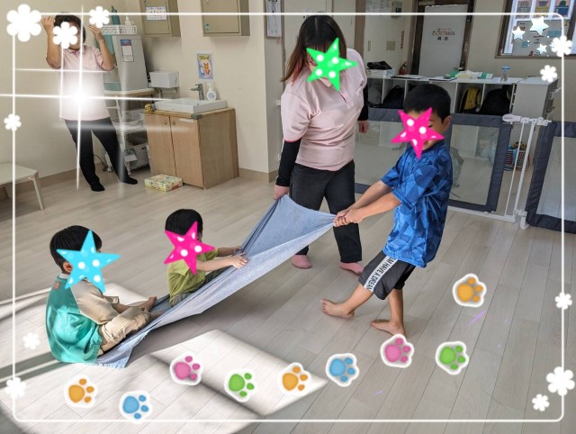 ぴゅーん「しっかりつかまっててね〜!」とバスタオルをスイスイ引っ張るお友達🤗楽しそう😝