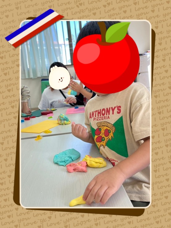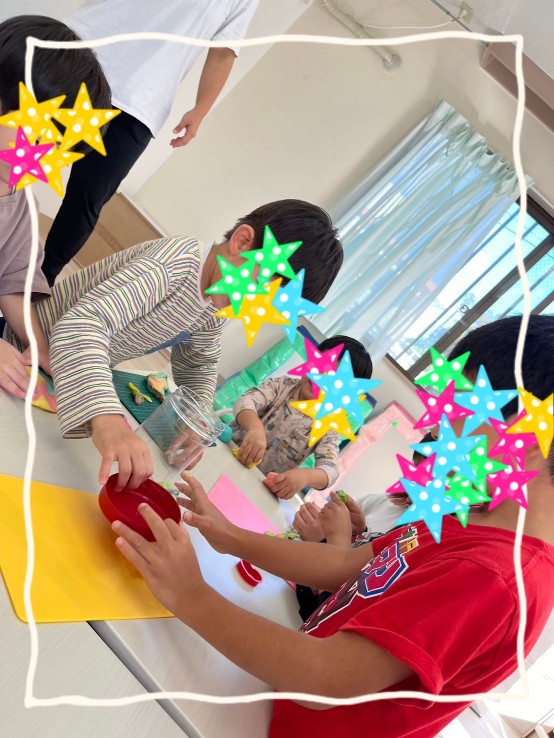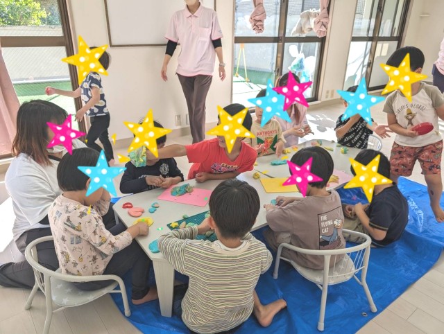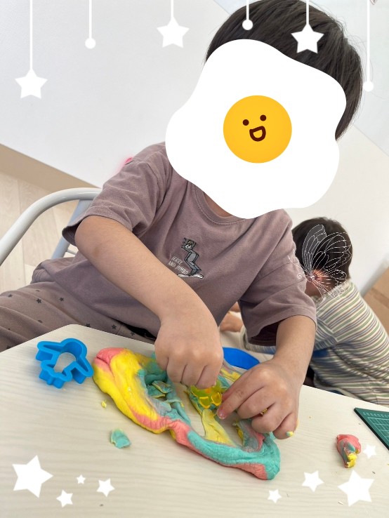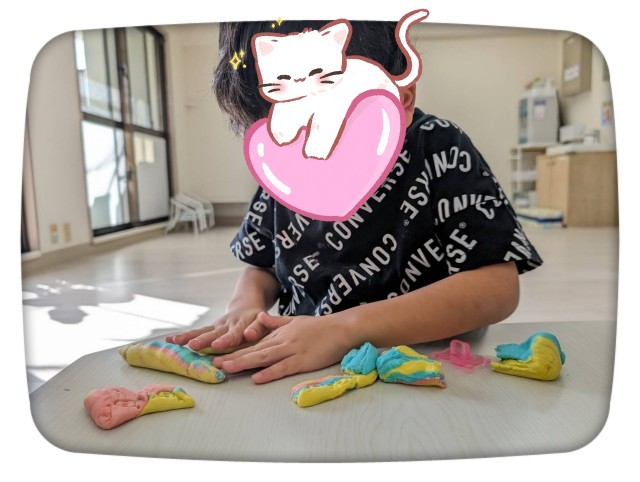 色を混ぜてこねたり、🖤♣️♠️型抜きでお友達に見せ合ったりと感触を楽しみ皆夢中です✨型抜きの貸し借りもスムーズでおしゃべりも弾みました☝️