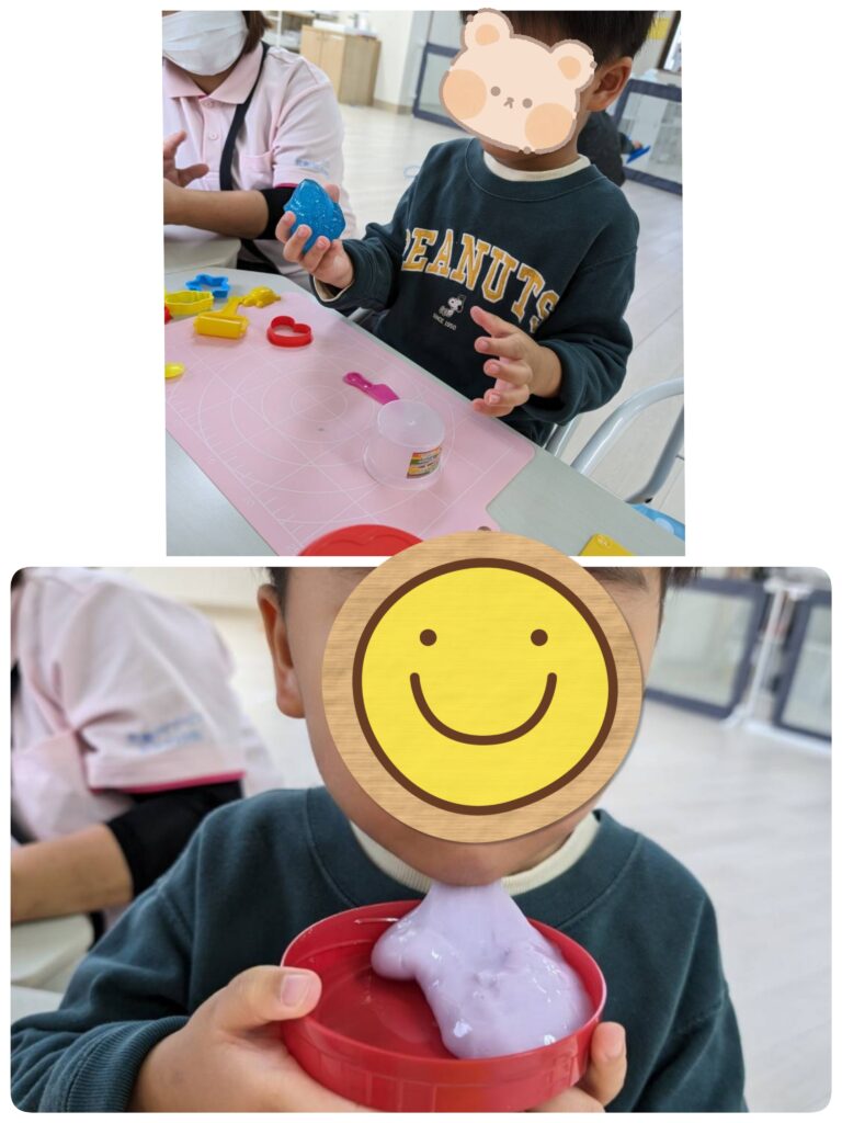 こちらは、感触遊びコーナーで感触遊びを楽しむ姿が見られました🔴🔵