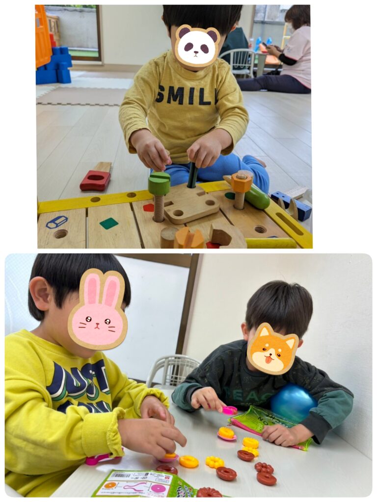 こちらは手指遊びコーナーです🖐✊✌大工さんになりきって、工具を使用します🔧トントントン〜〜〜🛠🔨指先を器用に使ってねじをくるくる回したり〜🔧とっても上手でしたよ〜!