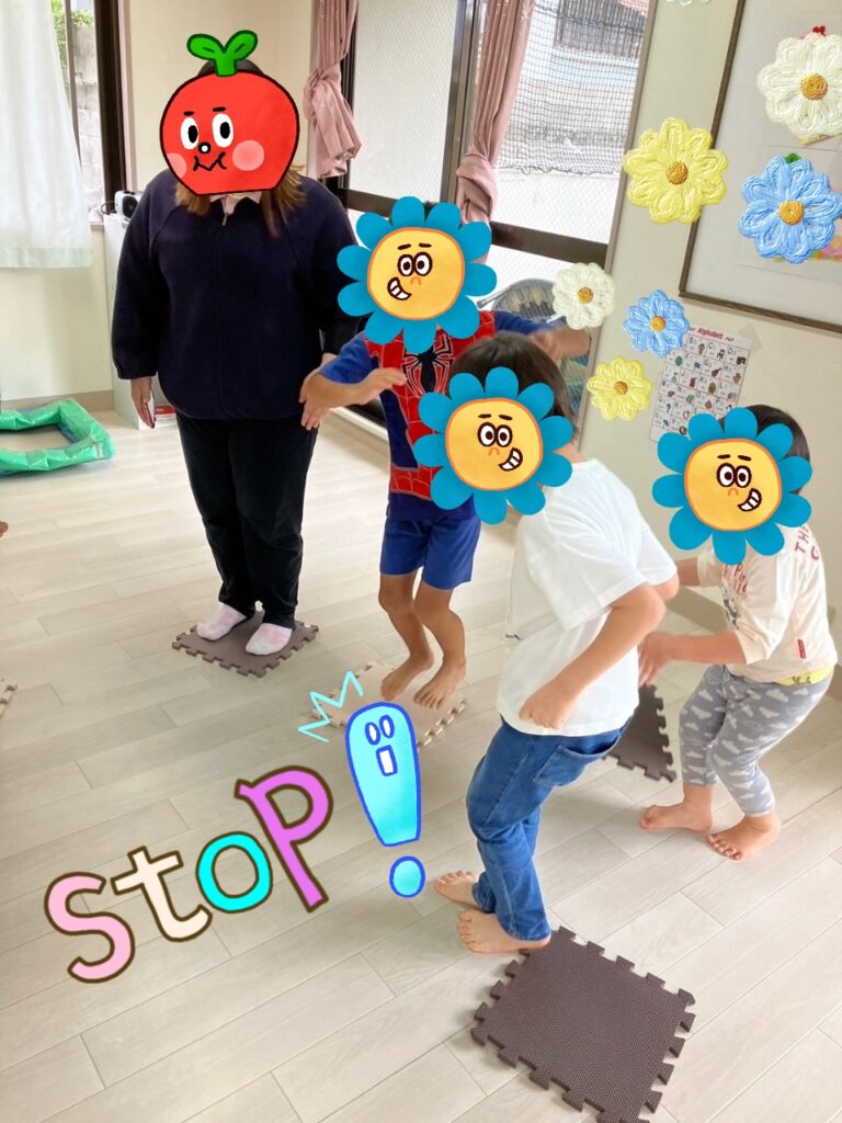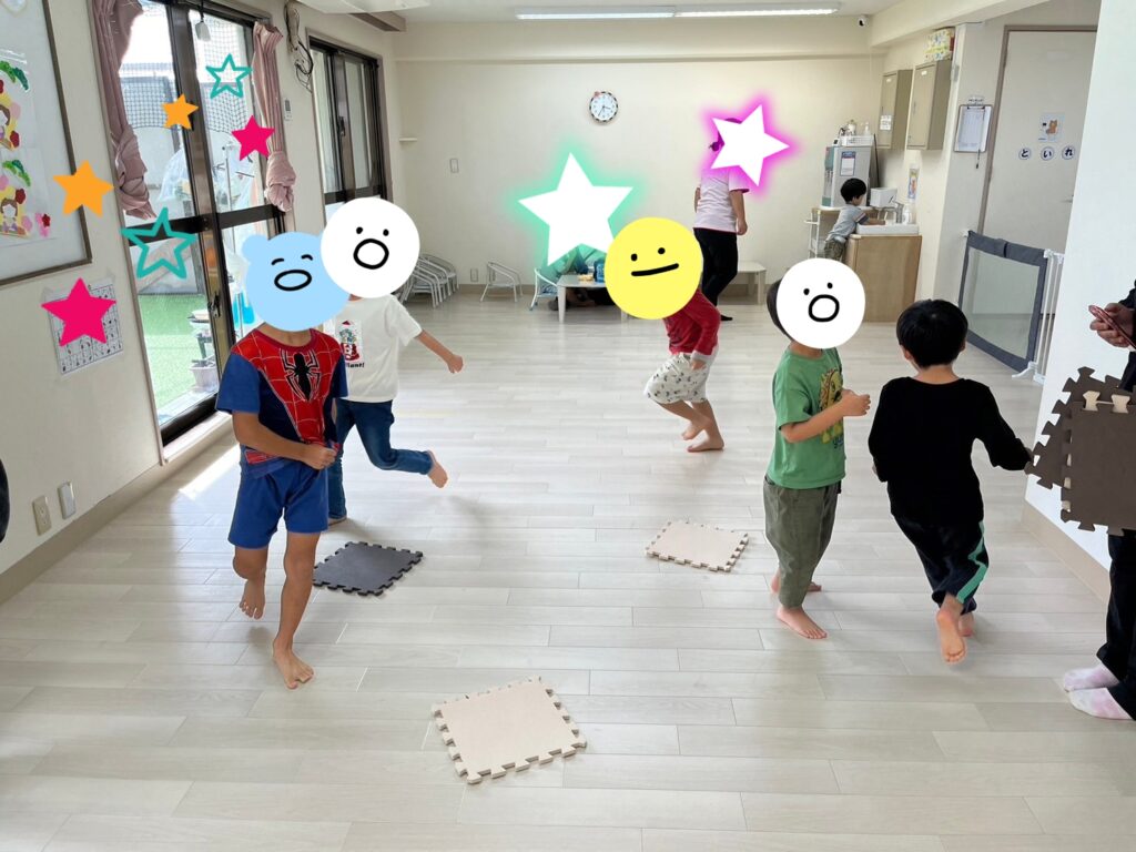 おやつのあとは、ミニゲームで”マットとりゲーム”をしました。椅子取りゲームのマットバージョンです✨