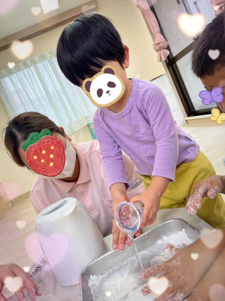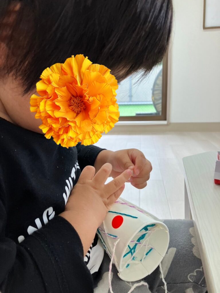 「見て見て〜」とカップを頭の上に乗せて、頭からカップが落ちないようにバランス感覚を楽しむ児童の姿も見られました🥳✨