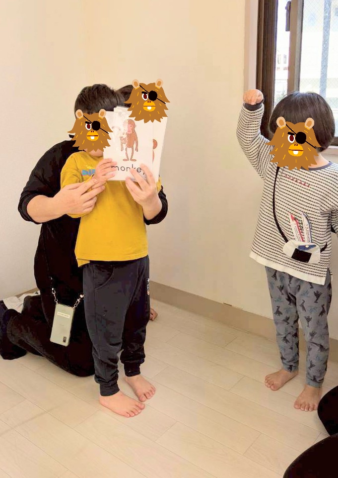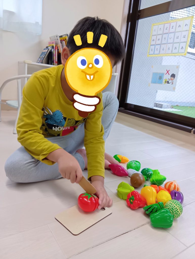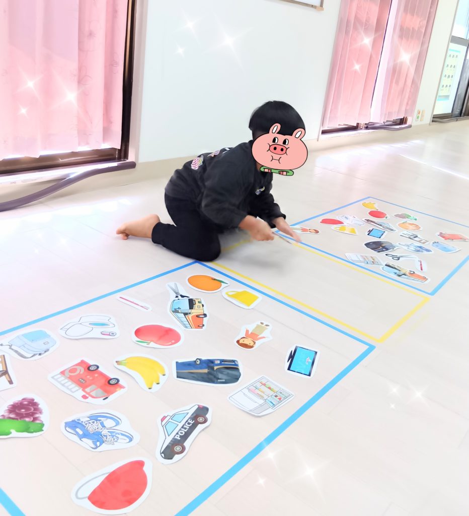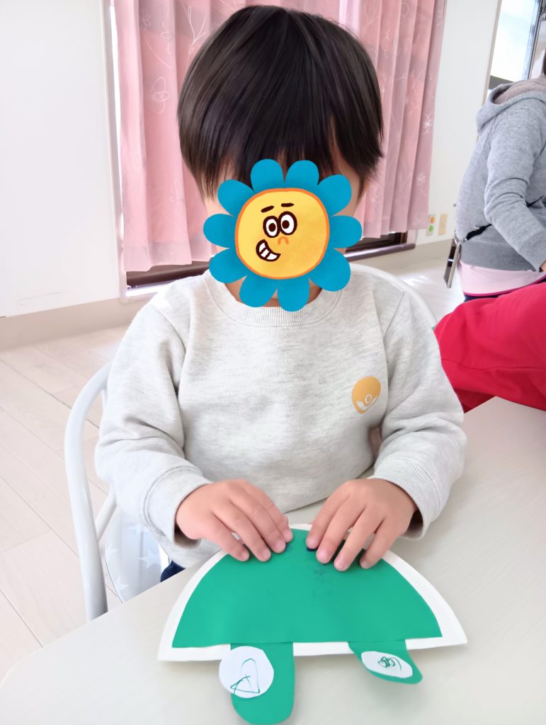 個別学習ではしりとりプリントをしましたよ✎✨️絵を見せて支援員が「これは何?」と聞くと「いす」「すいか」「りんご」と答えていました👄文字を書くように伝えると書き順は違えど、五十音表を見ながら一生懸命、真似て書いていましたよ👏五十音表を見せて「り」どこにあるのか聞くと「これ」と文字認識も出来ていました😊「かみなり」と「ごりら」は分からない様子だったため支援員と名前の確認しています😊