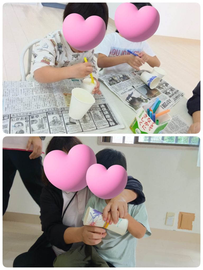 ◎ 紙コップにゴムを巻く、輪ゴムを引っ張るなどの動作を通じ、手先の巧緻性(細かい動き)を養う。◎紙コップに絵を描いたり、切ったり貼ったりする創作の楽しさを味わう。