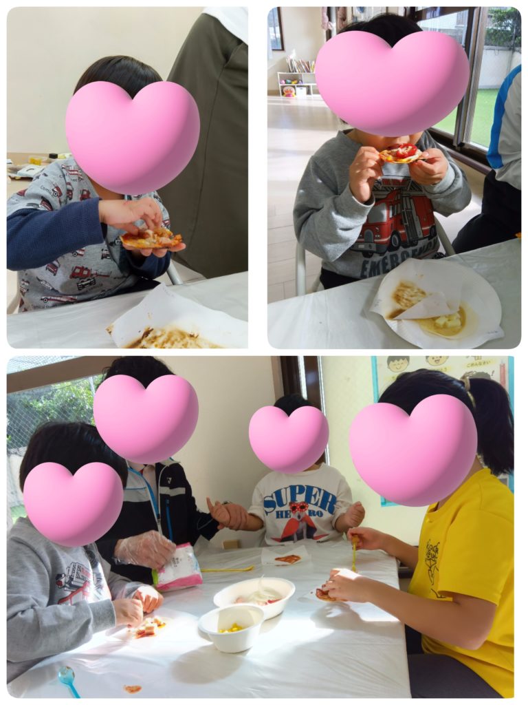 2種の和風ピザ、トマトソースピザの写真を見せて説明すると、子どもたち嬉しそうに「楽しみ〜♫」とワクワクドキドキ🥰ウィンナー、玉ねぎ、赤ピーマンは支援員が包丁に手を添えて一緒に切りましたよ〜🧅🔪和風ピザにはマヨネーズにしょうゆを混ぜ、皮に塗り、茹でたジャガイモ、炒めたしめじを、チーズをのせて焼いた、焼いた跡に刻みのりを乗せて食べました🤤いつもは嫌がって全く口にしない児童がいたりしますが、支援員が事前にクッキングの話をして「自分で作ったピザだから頑張って食べてみよう〜!」と意欲的な声かけをすると、初めて自ら作ったピザを手に取りトッピングのウィンナーと餃子の皮を少し食べてくれましたよ😲👏成長を感じました🧡
