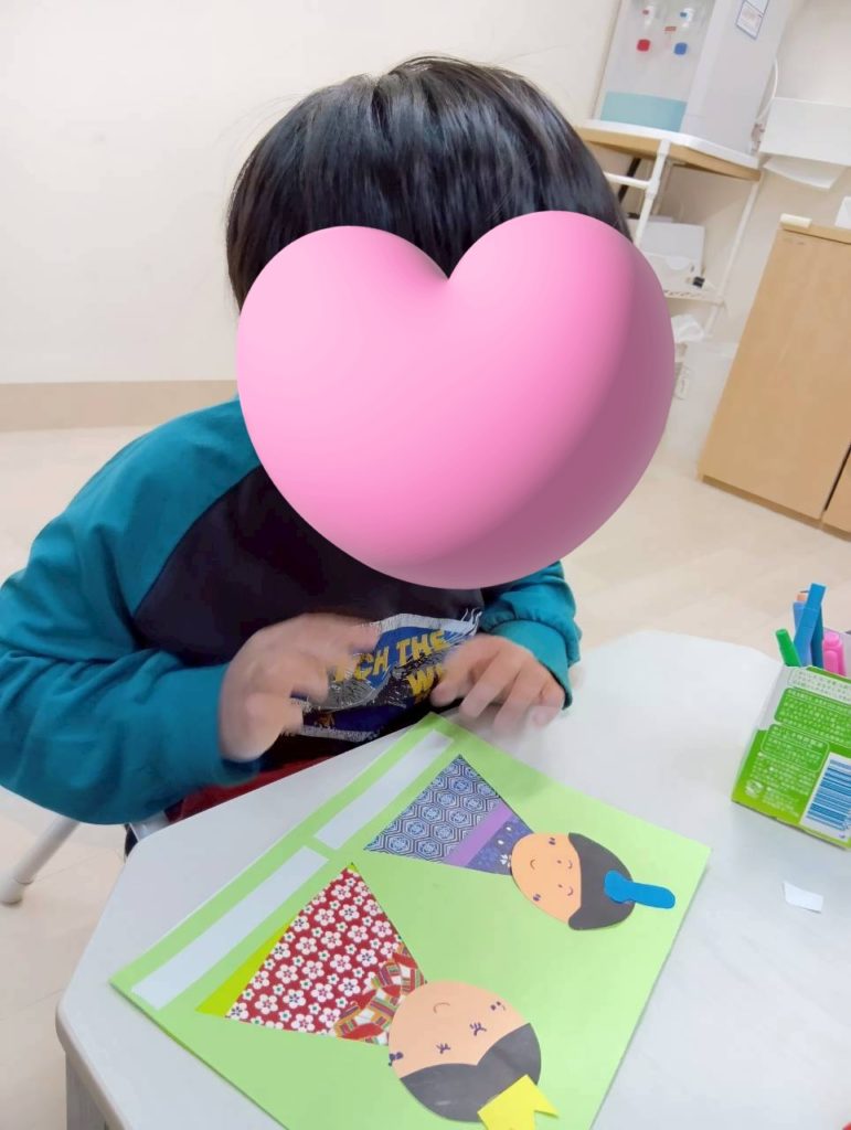 和柄の色紙とカラフルな色紙を3枚づつ選んで、お内裏様とお雛様の着物をコーディネートしましたよ🎎顔を書いて、花紙をクシュっと丸めて梅、桜に見立てて鮮やかに飾りました🌸