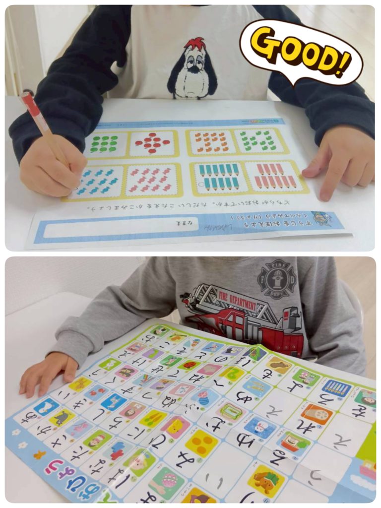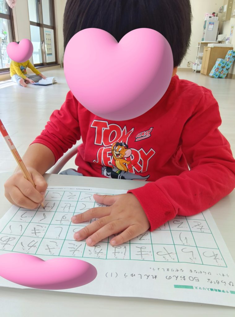 個別学習では五十音の正しい書き方プリントあ行~な行まで行いました✎✨️文字の書き順が書かれているため児童も「一番、二番、三番」と言いながら正しい書き順で書いていましたよ👏いつも「す」の丸の部分は丸と最後に書いていましたが、書き方をよく見て一回でくるりんぱとすの丸の部分を繋げて書くことができていました🙆